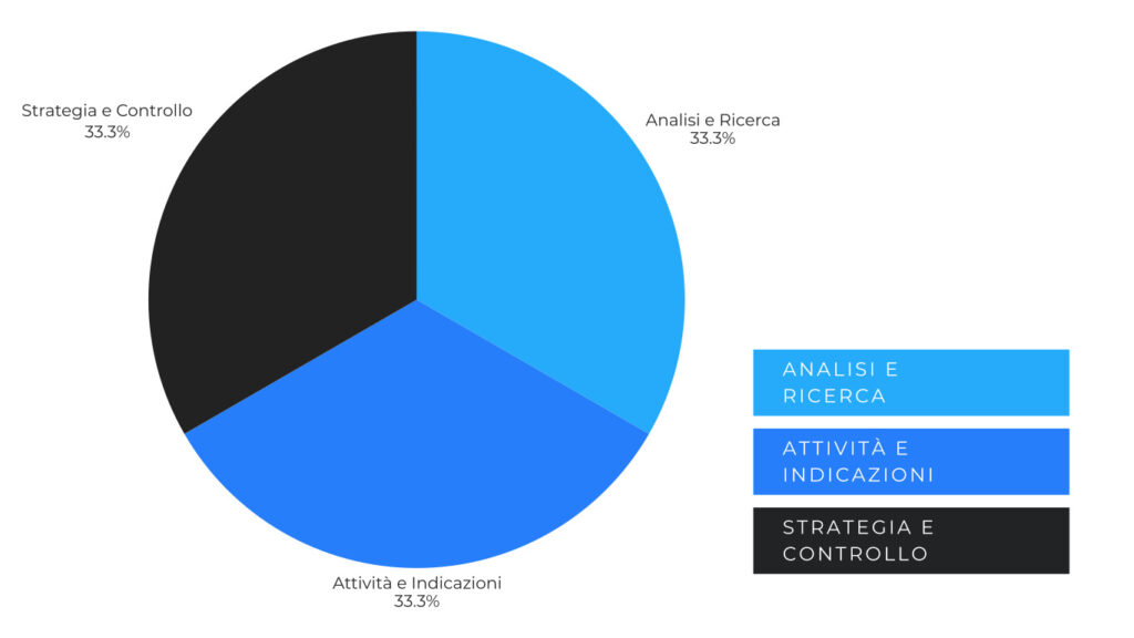 In ogni ambito – opportunità, posizionamento, fidelizzazione – Sinergica applica un approccio strutturato e ripetibile, costruito su 3 pilastri: Analisi, Strategia e Attività operative.